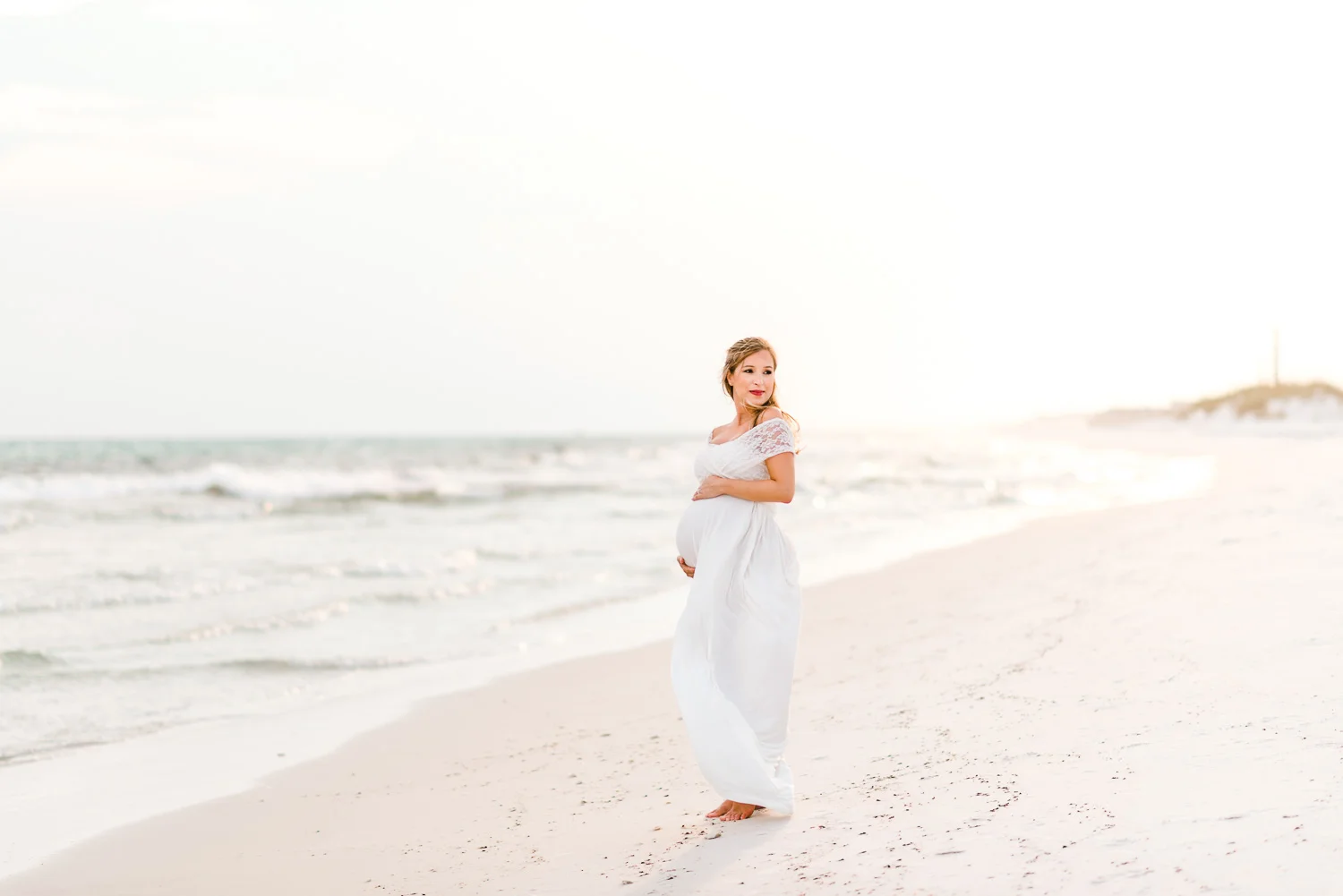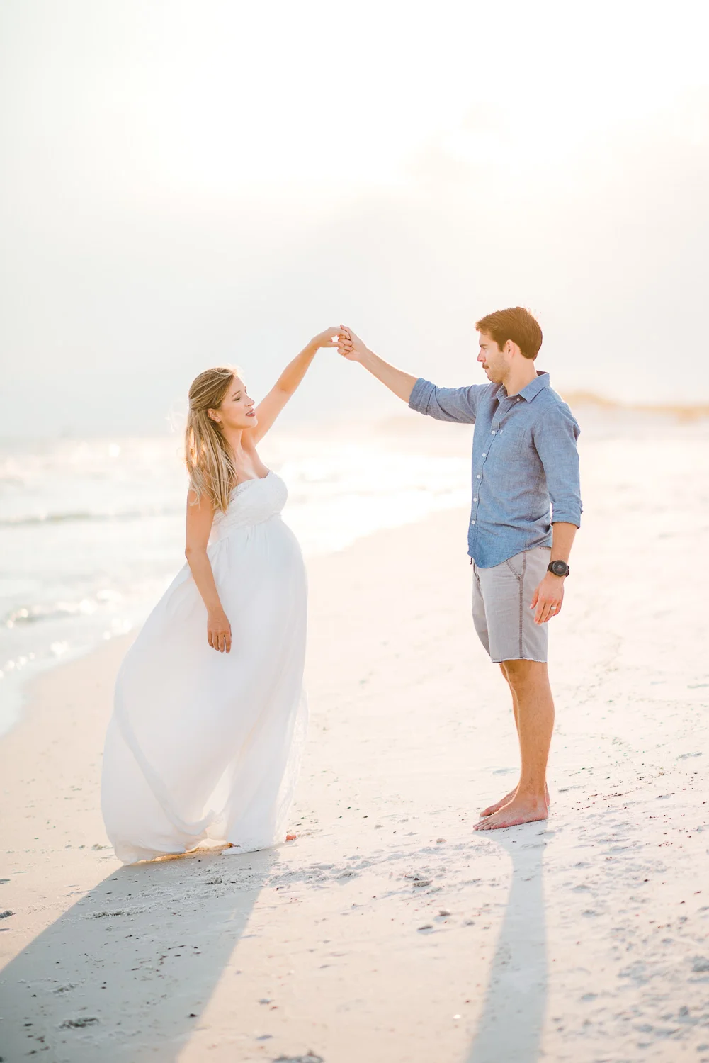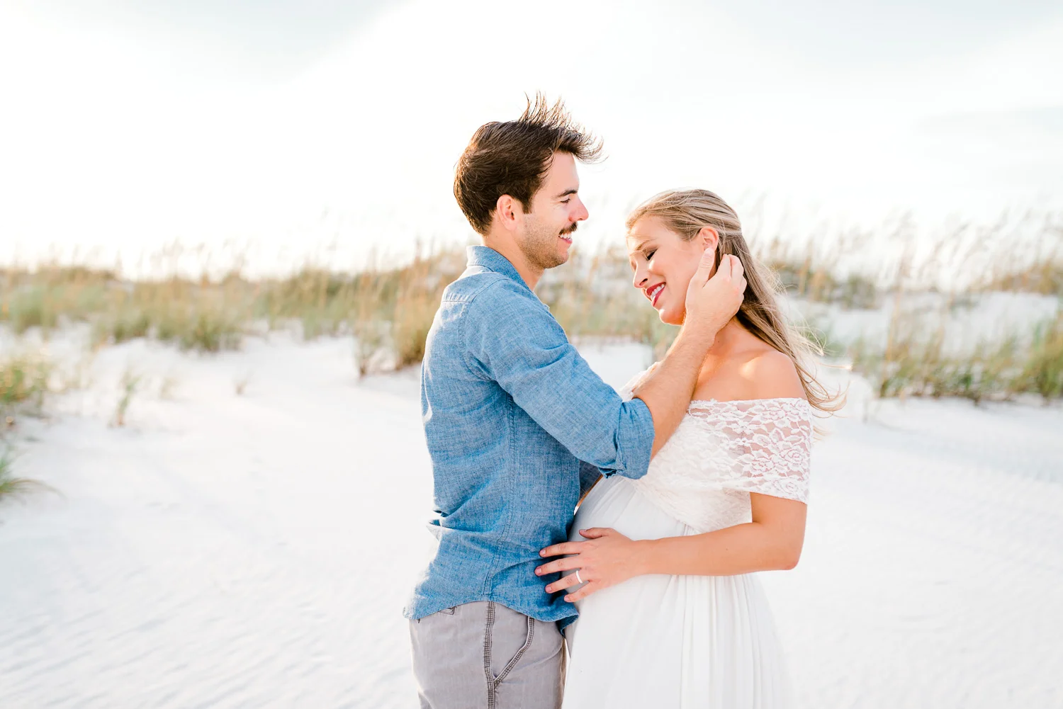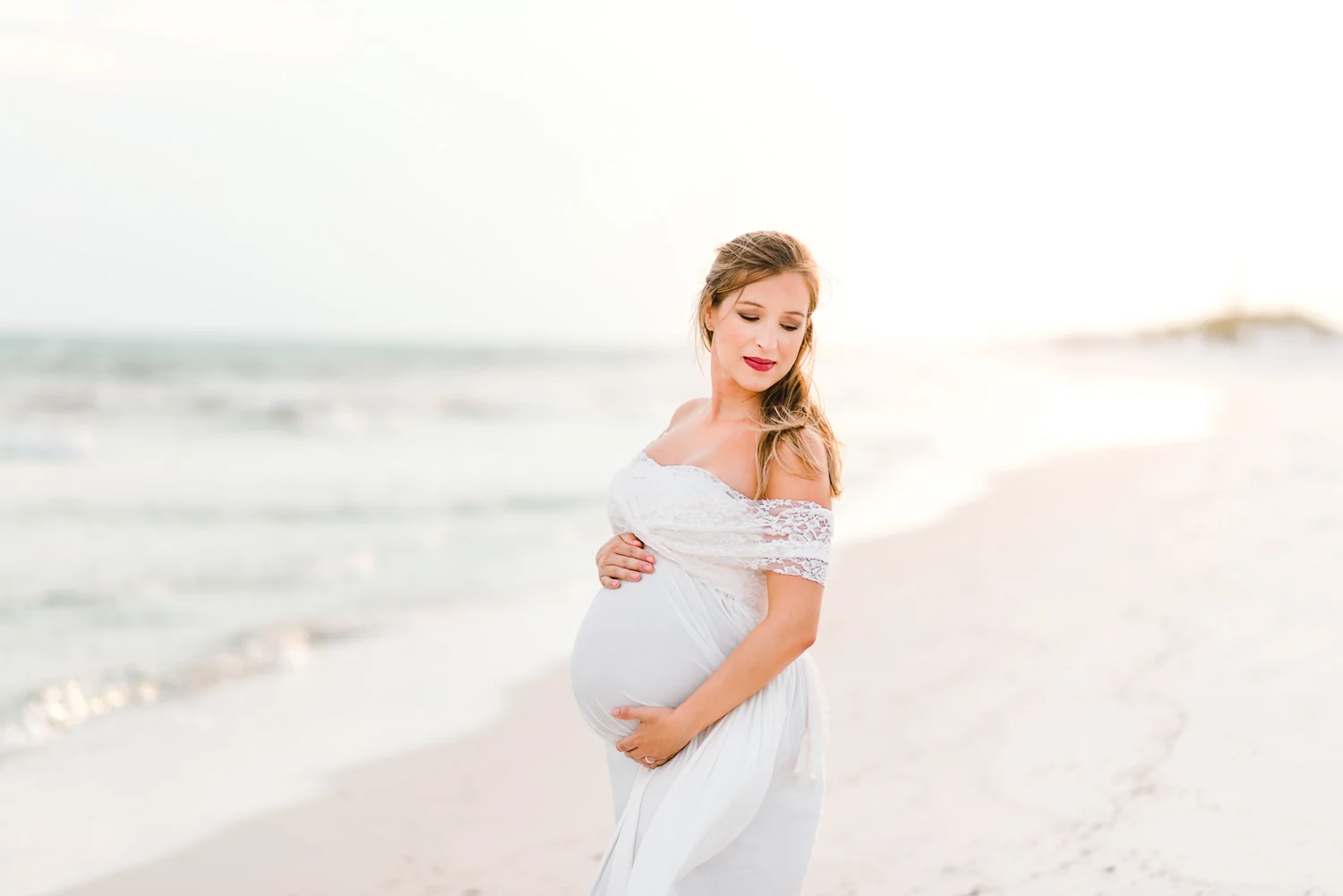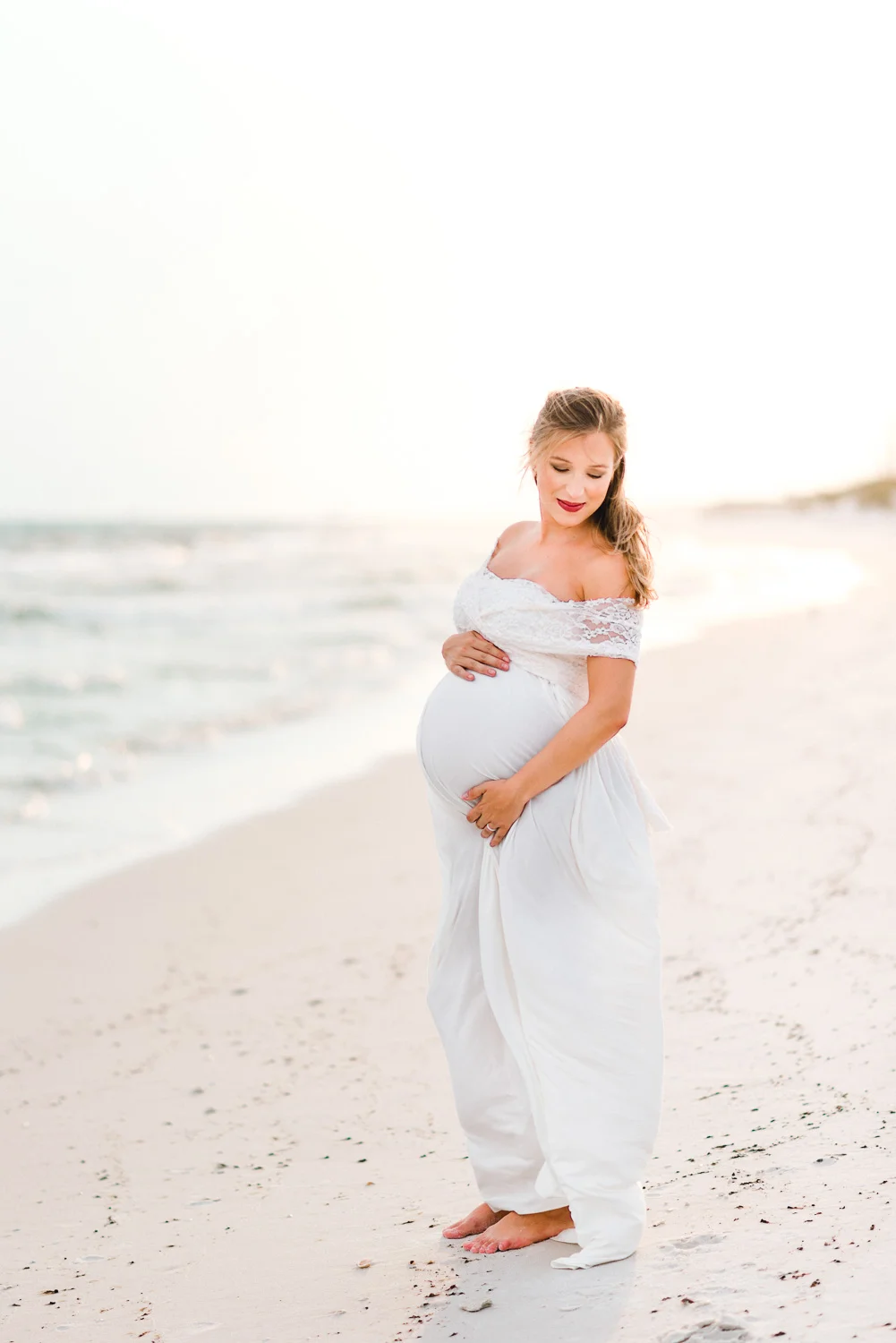 While preparing for her maternity session in Fort Walton Beach, Stephanie asked me if I thought it would be ok to wear white/off white on the beach. Would it blend into the sand too much? It may surprise you to know that it doesn’t. A monochromatic color palette actually works exceptionally well and is extremely flattering to skin tones. When working with monotones, it is a good idea to incorporate textures such as lace, knits, linen. Textures add another layer of visual interest to an image without competing or distracting from the subject. Stephanie chose a dress with a lace wrapped bodice that I think works perfectly.