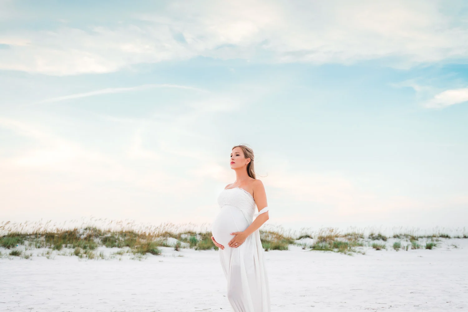 The key thing to remember here is that whatever you choose to wear for your maternity session should make it very apparent that you are pregnant. Without any extra work on your part. You should be able to move and sit in it and still look pregnant. If you have to stand a certain way, hold back fabric, or otherwise make an effort to define your belly, then it’s not a great choice.