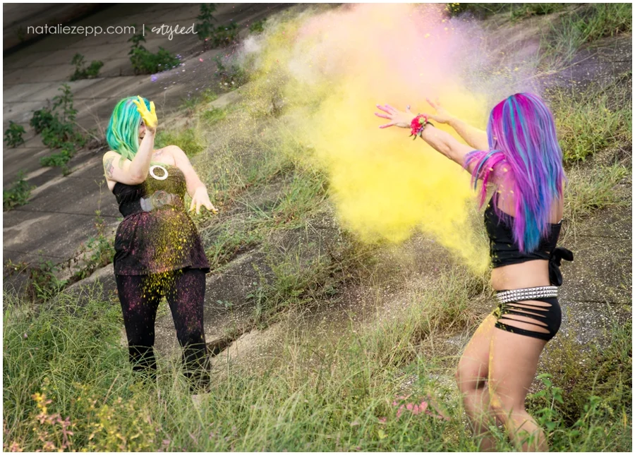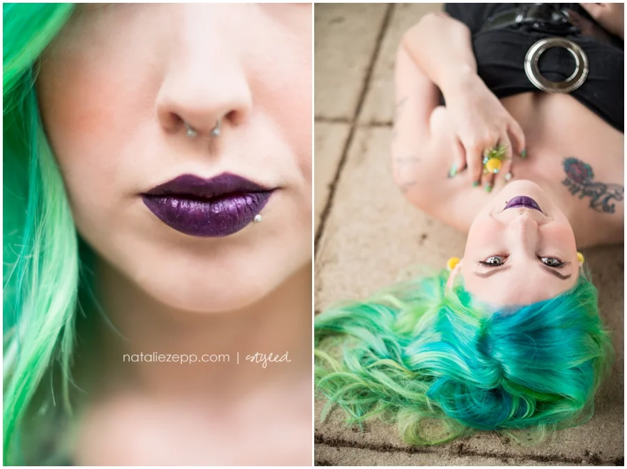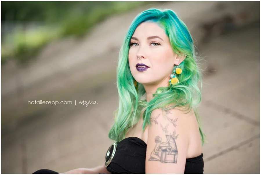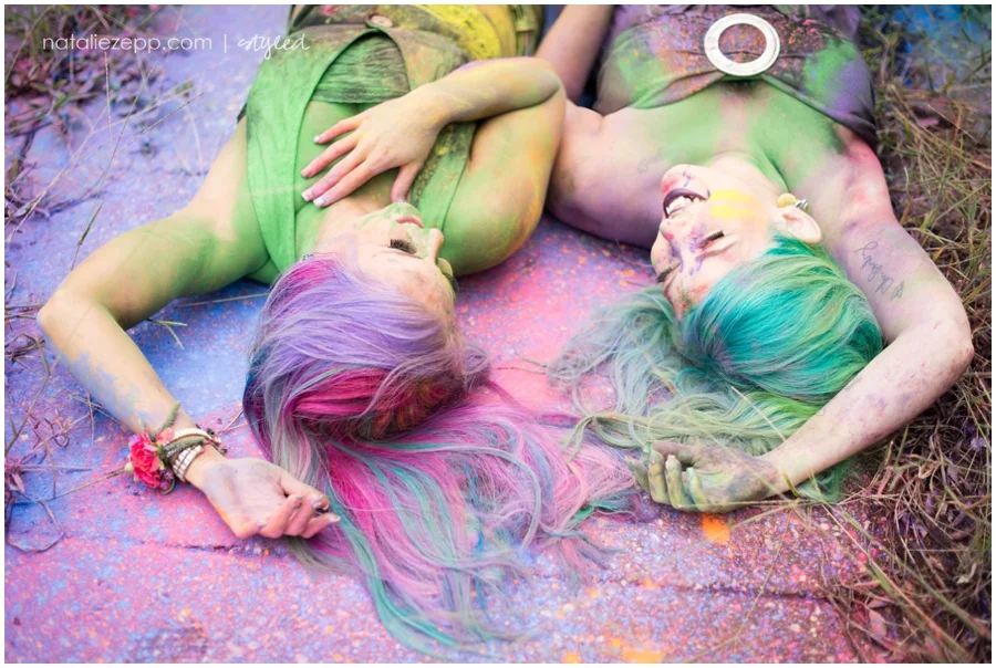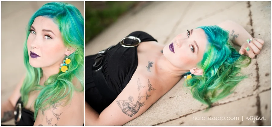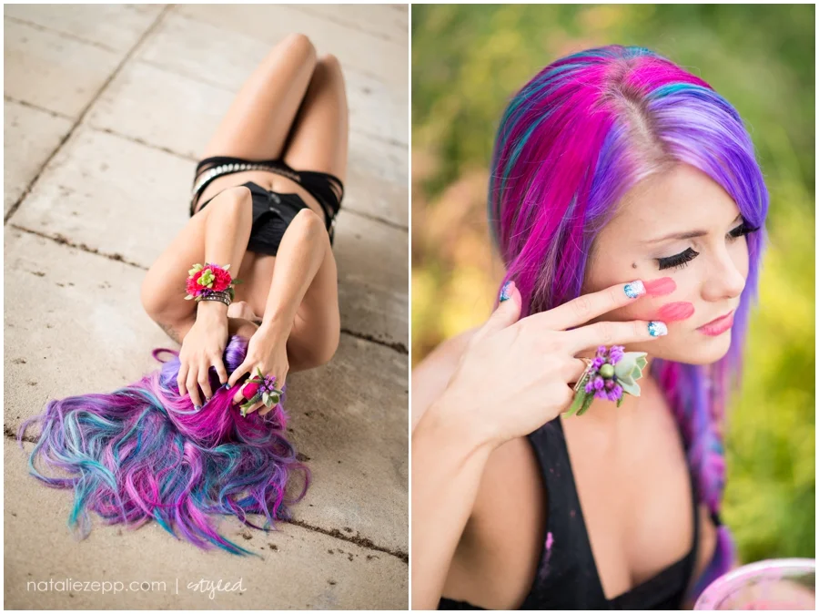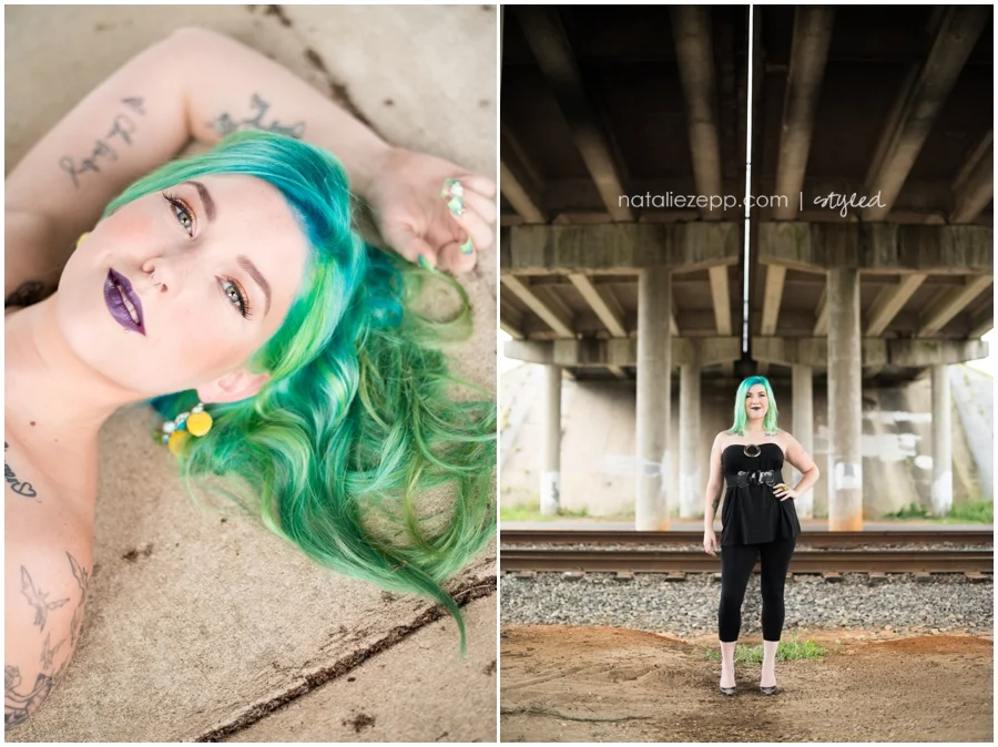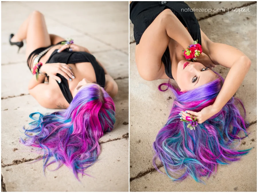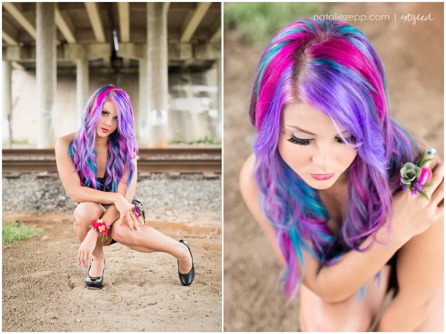 I feel incredibly lucky to know some of the most talented people in my city. I'm even luckier that they consider me talented enough to photograph their work. Last year Pensacola artist, Rebecca Taylor and her sweetheart Keith Landgraff opened the hottest salon in town, Vivid. Artistic Hair Design. And when I saw the incredible hair masterpieces they were turning out, of course I wanted to photograph them…like ALL of them. If I could just live there with my camera and shoot all of their daily masterpieces, I absolutely would! Rebecca and I collaborated and came up with the idea for a shoot to really highlight the bold and edgy vibe of the salon. We also enlisted the talents of local make-up artist Kat O'Connor of Kat O'Cosmetic Artistry, and fabulous floral artist Chloe Lawry of Supposey. I must also say a special thanks to my bestie and fellow photog Melissa Wilson of Melissa Wilson Photography for putting aside her camera for most of the shoot to be my assistant and safety net while scaling the steep incline of the overpass we shot under. Our gorgeous models here are Sidni Mickel (green and blue hair) and Tiffany Miller (pink and purple hair). They are total rockstars!
