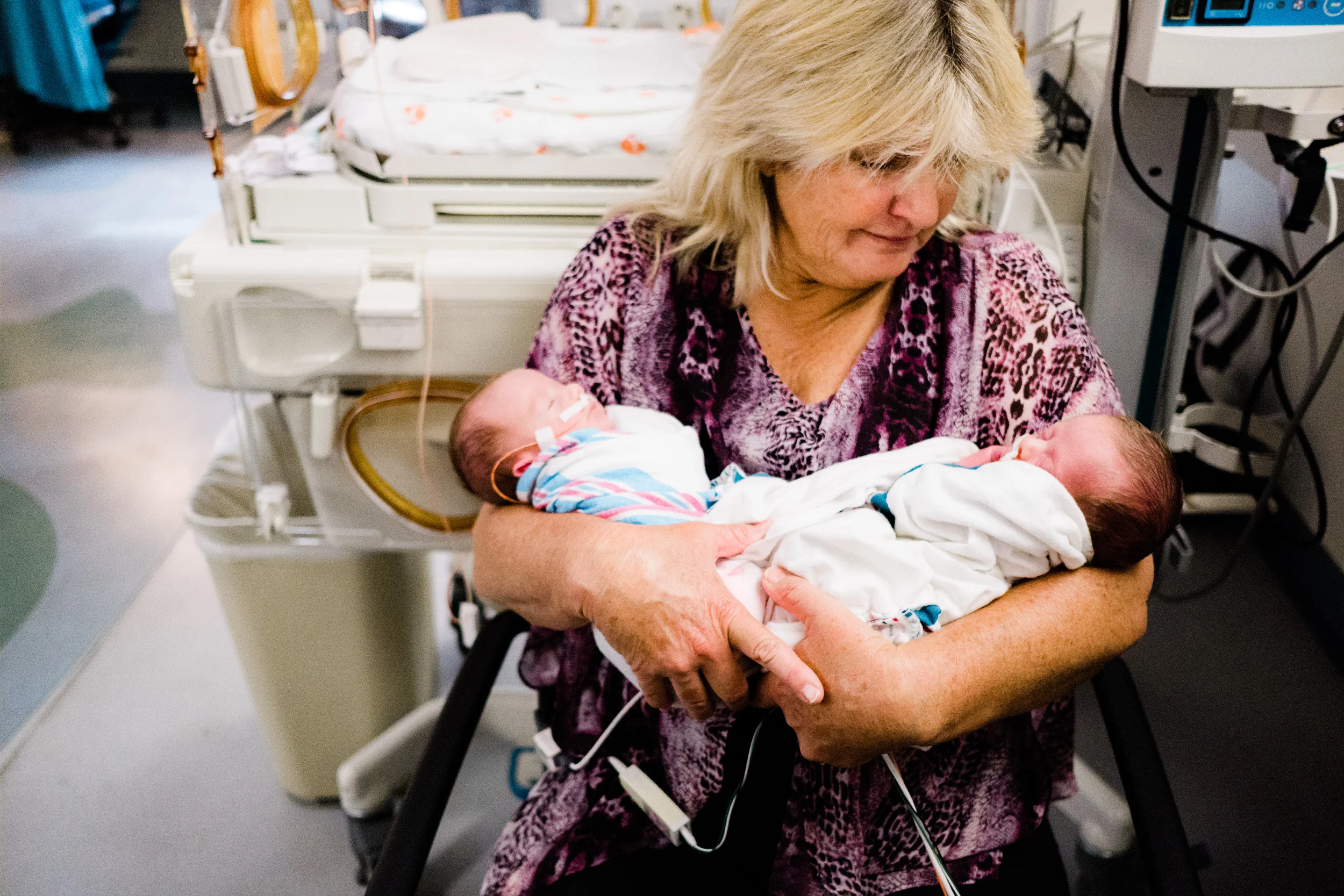 Higher order births always carry a higher risk of premature delivery early and NICU time. Maverick + Leo here were born at 29 weeks and actually have a set of twin big brothers who were born at 28 weeks! Their mama was sick and unable to visit them in the NICU, so one day while I was at the hospital for some marketing, I took an hour to hang out and help their grandma (a long time family friend/second mom to me) love on them.